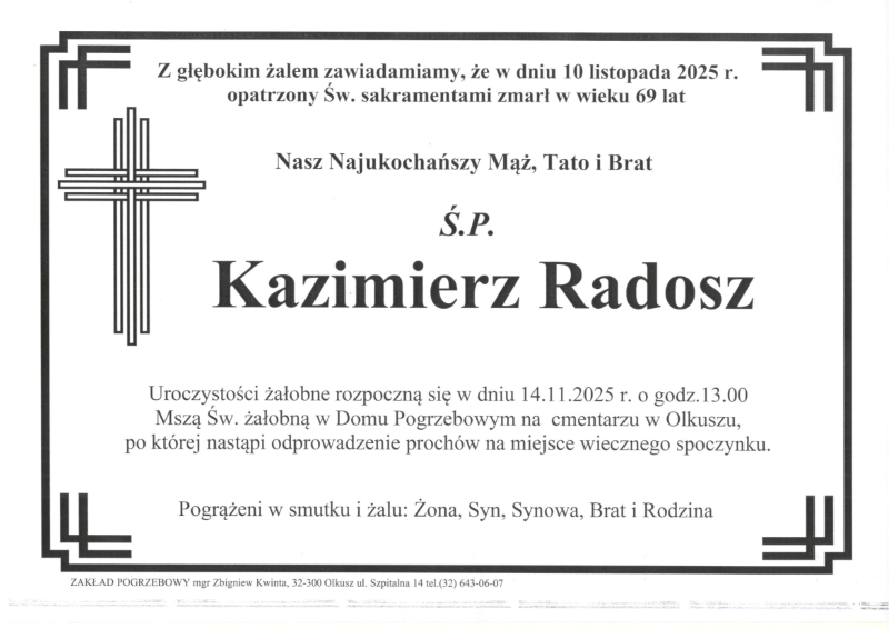 Zmarł śp. Kazimierz RADOSZ (lat 69) – (Olkusz).