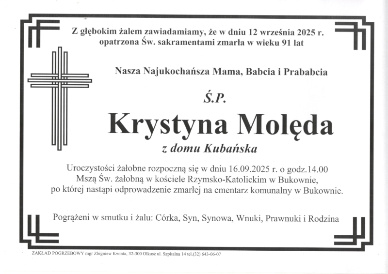 Pogrzeb śp. Krystyny Molędy odbędzie się w dniu 16 września 2025 r. Nabożeństwo żałobne o godz. 14.00 w Kościele Rzymsko-Katolickim w Bukownie. Sprawdź szczegóły klikając w klepsydrę… Modlimy się za duszę śp. Krystyny, a rodzinie zmarłej składamy kondolencje.