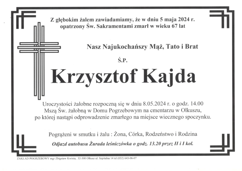 Pogrzeb śp. Krzysztofa Kajdy odbędzie się w dniu 8 maja 2024 r. Nabożeństwo żałobne o godz. 14.00 w Domu Pogrzebowym na cmentarzu w Olkuszu. Sprawdź szczegóły uroczystości pogrzebowych klikając w klepsydrę… Modlimy się za duszę śp. Krzysztofa, a rodzinie zmarłego składamy kondolencje.