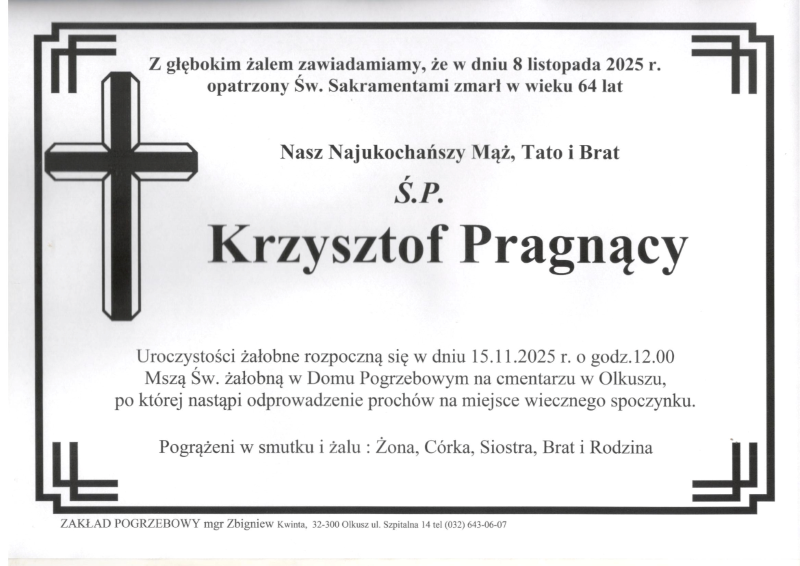 Zmarł śp. Krzysztof PRAGNĄCY (lat 64) – (Olkusz).