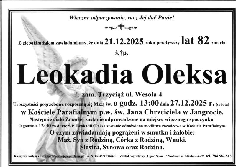 Pogrzeb śp. Leokadii Oleksy odbędzie się w dniu 27 grudnia 2025 r. Nabożeństwo żałobne o godz. 13:00 w Kościele Parafialnym w Jangrocie. Sprawdź szczegóły uroczystości pogrzebowych klikając w klepsydrę… Modlimy się za dusze śp. Leokadii, a rodzinie zmarłej składamy kondolencje.