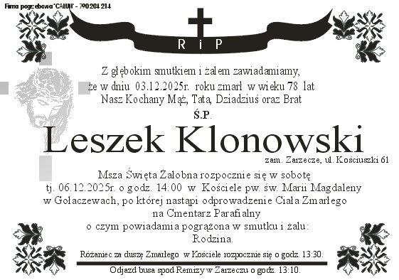 Pogrzeb śp. Leszka Klonowskiego odbędzie się w dniu 6 grudnia 2025 r. Nabożeństwo żałobne o godz. 14:00 w Kościele Parafialnym w Gołaczewach. Sprawdź szczegóły uroczystości pogrzebowych klikając w klepsydrę… Modlimy się za dusze śp. Leszka, a rodzinie zmarłego składamy kondolencje.