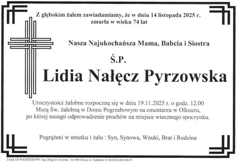 Pogrzeb śp. Lidii Nałęcz Pyrzowskiej odbędzie się w dniu 19 listopada 2025 r. Nabożeństwo żałobne o godz. 12.00 w Domu Pogrzebowym na cmentarzu w Olkuszu. Sprawdź szczegóły klikając w klepsydrę… Modlimy się za duszę śp. Lidii, a rodzinie zmarłej składamy kondolencje.