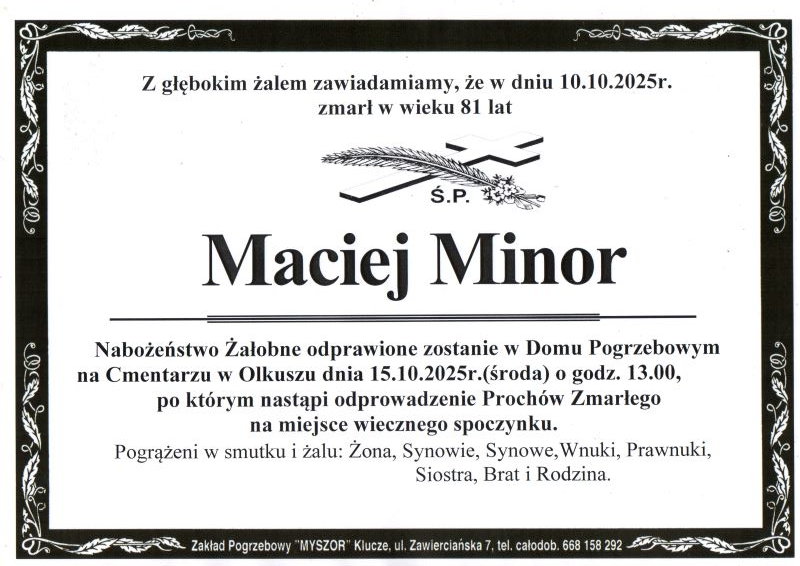 Zmarł śp. Maciej MINOR (lat 81) – (Olkusz).