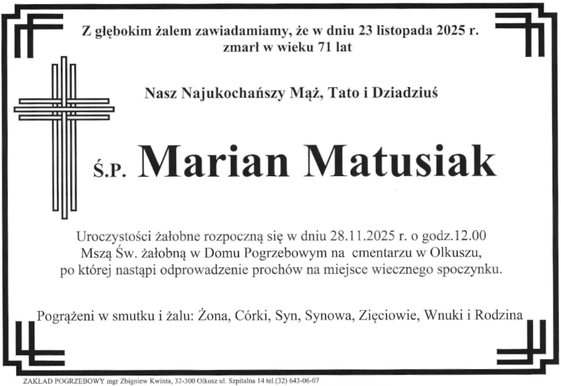 Pogrzeb śp. Mariana Matusiaka odbędzie się w dniu 28 listopada 2025 r. Nabożeństwo żałobne o godz. 12.00 w Domu Pogrzebowym na cmentarzu w Olkuszu. Sprawdź szczegóły uroczystości pogrzebowych klikając w klepsydrę… Modlimy się za duszę śp. Mariana, a rodzinie zmarłego składamy kondolencje.