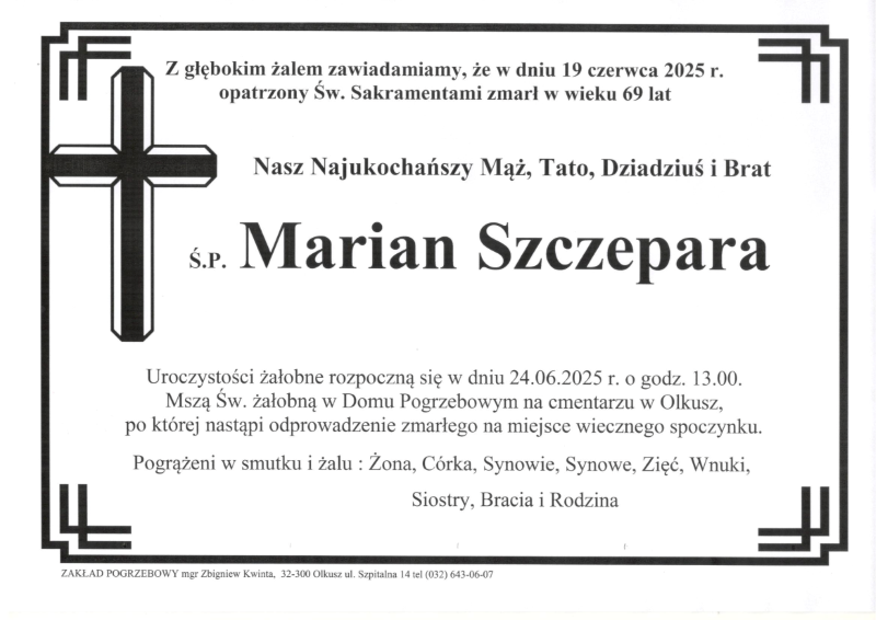 Pogrzeb śp. Mariana Szczepary odbędzie się w dniu 24 czerwca 2025 r. Nabożeństwo żałobne o godz. 13.00 w Domu Pogrzebowym na cmentarzu w Olkuszu. Sprawdź szczegóły uroczystości pogrzebowych klikając w klepsydrę… Modlimy się za duszę śp. Mariana, a rodzinie zmarłego składamy kondolencje.