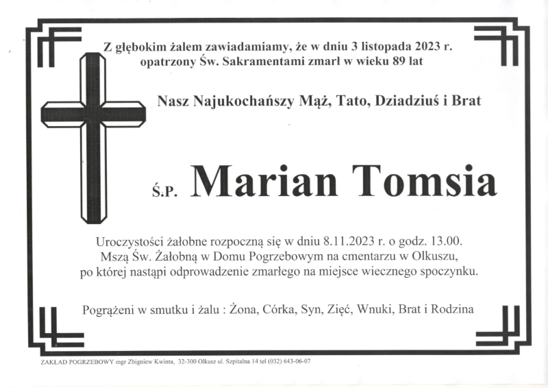 Zmarł śp. Marian TOMSIA (lat 89) – (Olkusz).