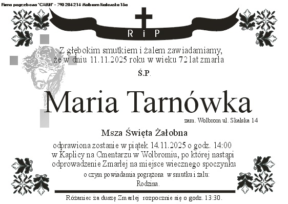 Pogrzeb śp. Marii Tarnówki odbędzie się w dniu 14 listopada 2025 r. Nabożeństwo żałobne o godz. 14:00 w Kaplicy na cmentarzu w Wolbromiu. Sprawdź szczegóły uroczystości pogrzebowych klikając w klepsydrę… Modlimy się za dusze śp. Marii, a rodzinie zmarłej składamy kondolencje.