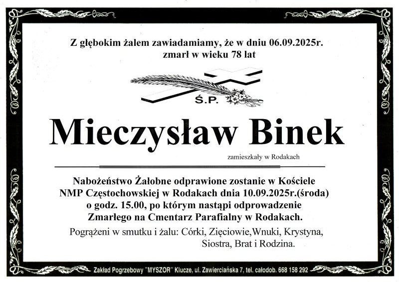 Pogrzeb śp. Mieczysława Binka odbędzie się w dniu 10 września 2025 r. Nabożeństwo żałobne o godz. 15.00 w Kościele Parafialnym w Rodakach. Sprawdź szczegóły uroczystości pogrzebowych klikając w klepsydrę… Modlimy się za duszę śp. Mieczysława, a rodzinie zmarłego składamy kondolencje.