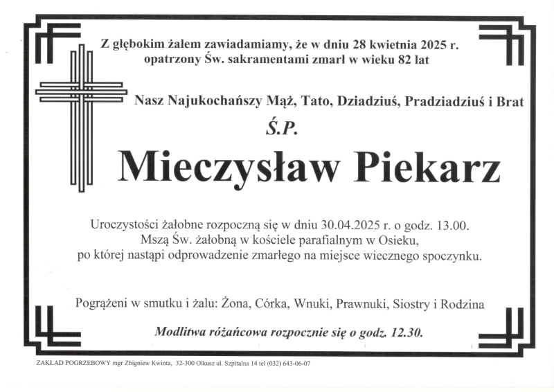 Zmarł śp. Mieczysław PIEKARZ (lat 82) – (Osiek).