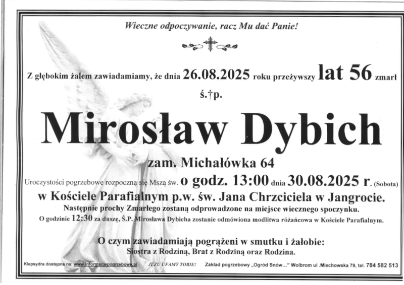 Pogrzeb śp. Mirosława Dybicha odbędzie się w dniu 30 sierpnia 2025 r. Nabożeństwo żałobne o godz. 13:00 w Kościele Parafialnym w Jangrocie. Sprawdź szczegóły uroczystości pogrzebowych klikając w klepsydrę… Modlimy się za dusze śp. Mirosława, a rodzinie zmarłego składamy kondolencje.
