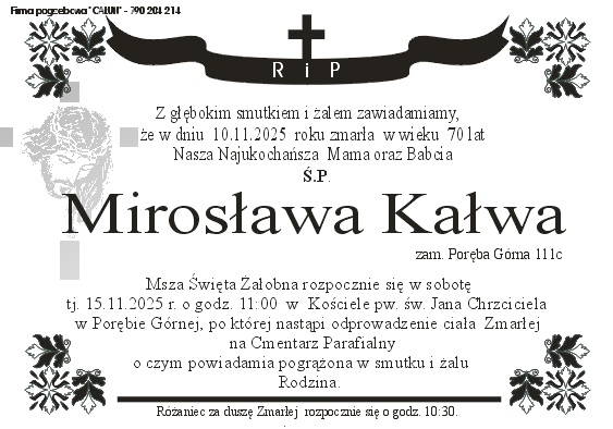 Pogrzeb śp. Mirosławy Kałwy odbędzie się w dniu 15 listopada 2025 r. Nabożeństwo żałobne o godz. 11:00 w Kościele Parafialnym w Porębie Górnej. Sprawdź szczegóły uroczystości pogrzebowych klikając w klepsydrę… Modlimy się za dusze śp. Mirosławy, a rodzinie zmarłej składamy kondolencje.