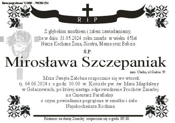 Pogrzeb śp. Mirosławy Szczepaniak odbędzie się w dniu 4 czerwca 2024 r. Nabożeństwo żałobne o godz. 10:00 w Kościele Parafialnym w Gołaczewach. Sprawdź szczegóły uroczystości pogrzebowych klikając w klepsydrę… Modlimy się za dusze śp. Mirosławy, a rodzinie zmarłej składamy kondolencje.