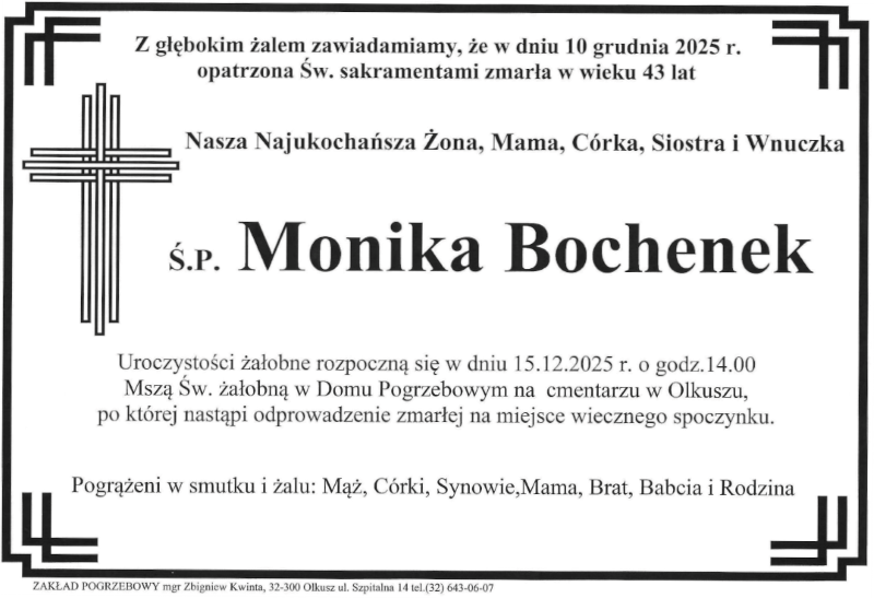 Pogrzeb śp. Moniki Bochenek odbędzie się w dniu 15 grudnia 2025 r. Nabożeństwo żałobne o godz. 14.00 w Domu Pogrzebowym na cmentarzu w Olkuszu. Sprawdź szczegóły klikając w klepsydrę… Modlimy się za duszę śp. Moniki, a rodzinie zmarłej składamy kondolencje.