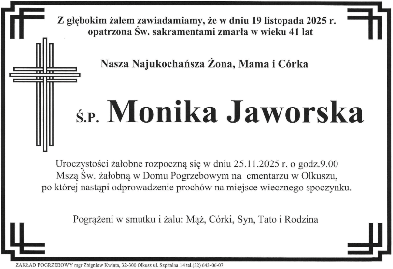 Pogrzeb śp. Moniki Jaworskiej odbędzie się w dniu 25 listopada 2025 r. Nabożeństwo żałobne o godz. 9.00 w Domu Pogrzebowym na cmentarzu w Olkuszu. Sprawdź szczegóły klikając w klepsydrę… Modlimy się za duszę śp. Moniki, a rodzinie zmarłej składamy kondolencje.