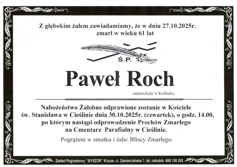 Pogrzeb śp. Pawła Rocha odbędzie się w dniu 30 października 2025 r. Nabożeństwo żałobne o godz. 14.00 w Kościele Parafialnym w Cieślinie. Sprawdź szczegóły uroczystości pogrzebowych klikając w klepsydrę… Modlimy się za duszę śp. Pawła, a rodzinie zmarłego składamy kondolencje.