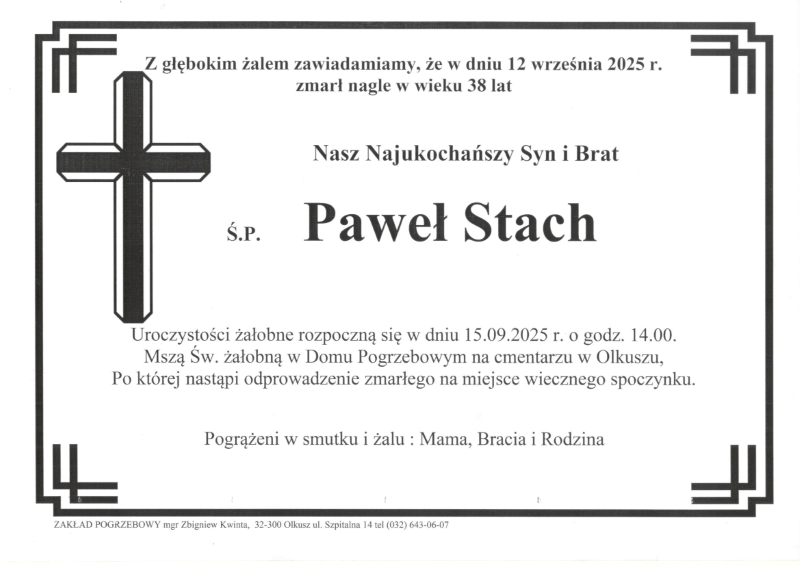 Zmarł śp. Paweł STACH (lat 38) – (Olkusz).