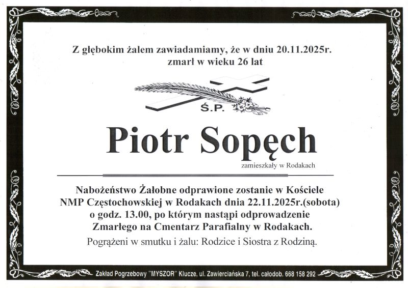 Pogrzeb śp. Piotra Sopęcha odbędzie się w dniu 22 listopada 2025 r. Nabożeństwo żałobne o godz. 13.00 w Kościele Parafialnym w Rodakach. Sprawdź szczegóły uroczystości pogrzebowych klikając w klepsydrę… Modlimy się za duszę śp. Piotra, a rodzinie zmarłego składamy kondolencje.