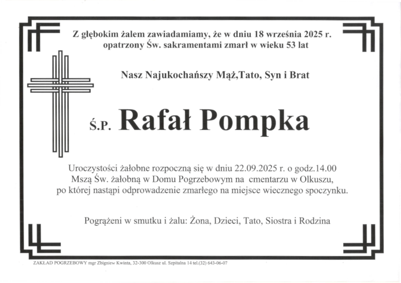 Pogrzeb śp. Rafała Pompki odbędzie się w dniu 22 września 2025 r. Nabożeństwo żałobne o godz. 14.00 w Domu Pogrzebowym na cmentarzu w Olkuszu. Sprawdź szczegóły uroczystości pogrzebowych klikając w klepsydrę… Modlimy się za duszę śp. Rafała, a rodzinie zmarłego składamy kondolencje.