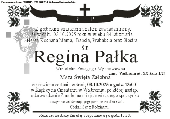 Pogrzeb śp. Reginy Pałki odbędzie się w dniu 8 października 2025 r. Nabożeństwo żałobne o godz. 13:00 w Kaplicy na cmentarzu w Wolbromiu. Sprawdź szczegóły uroczystości pogrzebowych klikając w klepsydrę… Modlimy się za dusze śp. Reginy, a rodzinie zmarłej składamy kondolencje.