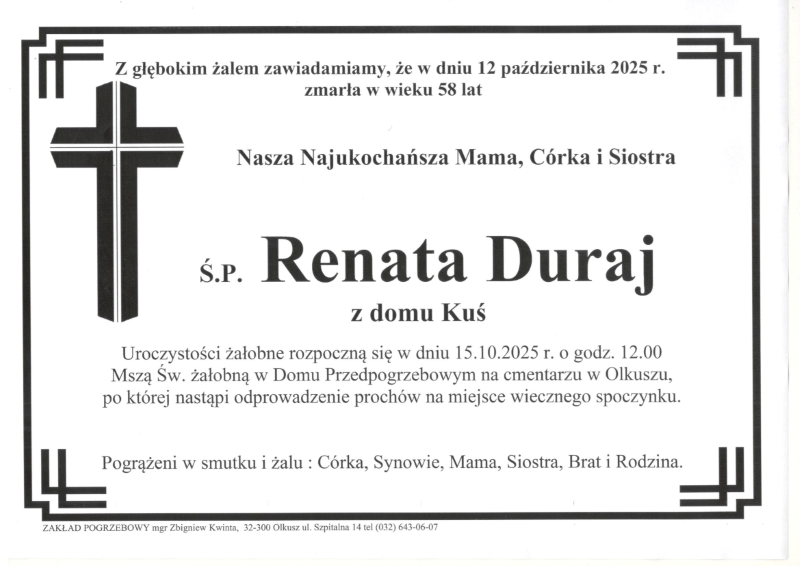 Pogrzeb śp. Renaty Duraj odbędzie się w dniu 15 października 2025 r. Nabożeństwo żałobne o godz. 12.00 w Domu Pogrzebowym na cmentarzu w Olkuszu. Sprawdź szczegóły klikając w klepsydrę… Modlimy się za duszę śp. Renaty, a rodzinie zmarłej składamy kondolencje.