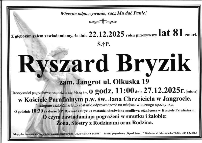 Pogrzeb śp. Ryszarda Bryzika odbędzie się w dniu 27 grudnia 2025 r. Nabożeństwo żałobne o godz. 11:00 w Kościele Parafialnym w Jangrocie. Sprawdź szczegóły uroczystości pogrzebowych klikając w klepsydrę… Modlimy się za dusze śp. Ryszarda, a rodzinie zmarłego składamy kondolencje.