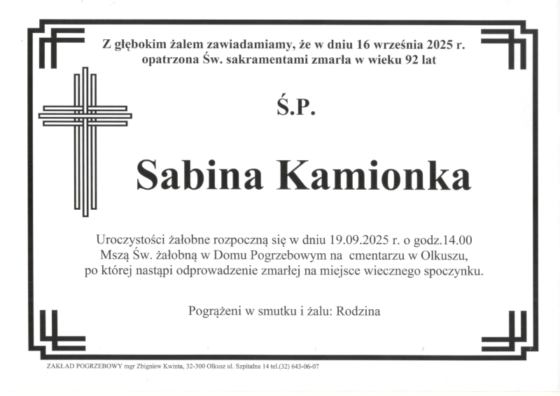 Pogrzeb śp. Sabiny Kamionki odbędzie się w dniu 19 września 2025 r. Nabożeństwo żałobne o godz. 14.00 w Domu Pogrzebowym na cmentarzu w Olkuszu. Sprawdź szczegóły klikając w klepsydrę… Modlimy się za duszę śp. Sabiny, a rodzinie zmarłej składamy kondolencje.