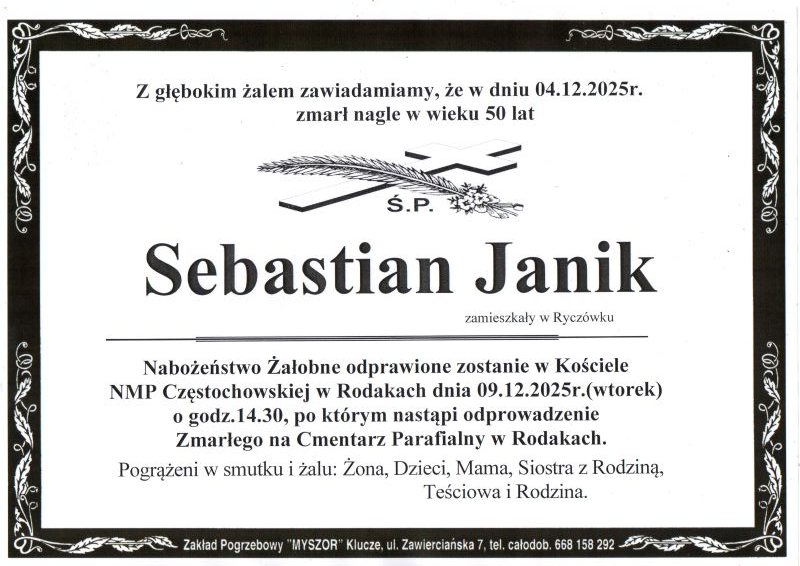Pogrzeb śp. Sebastiana Janika odbędzie się w dniu 9 grudnia 2025 r. Nabożeństwo żałobne o godz. 14.30 w Kościele Parafialnym w Rodakach. Sprawdź szczegóły uroczystości pogrzebowych klikając w klepsydrę… Modlimy się za duszę śp. Sebastiana, a rodzinie zmarłego składamy kondolencje.