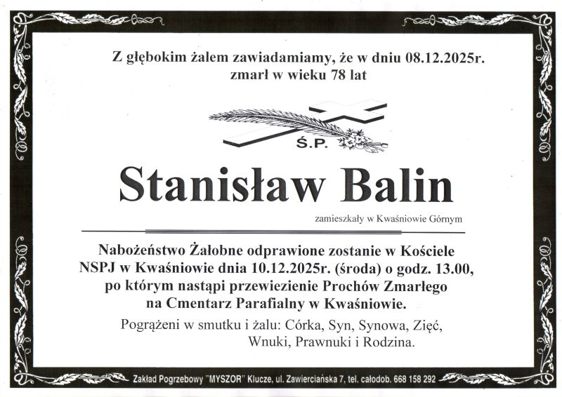 Pogrzeb śp. Stanisława Balina odbędzie się w dniu 10 grudnia 2025 r. Nabożeństwo żałobne o godz. 13.00 w Kościele Parafialnym w Kwaśniowie. Sprawdź szczegóły uroczystości pogrzebowych klikając w klepsydrę… Modlimy się za duszę śp. Stanisława, a rodzinie zmarłego składamy kondolencje.