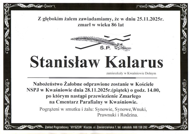 Pogrzeb śp. Stanisława Kalarusa odbędzie się w dniu 28 listopada 2025 r. Nabożeństwo żałobne o godz. 14.00 w Kościele Parafialnym w Kwaśniowie. Sprawdź szczegóły uroczystości pogrzebowych klikając w klepsydrę… Modlimy się za duszę śp. Stanisława, a rodzinie zmarłego składamy kondolencje.