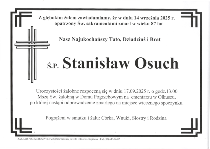 Zmarł śp. Stanisław OSUCH (lat 87) – (Olkusz).