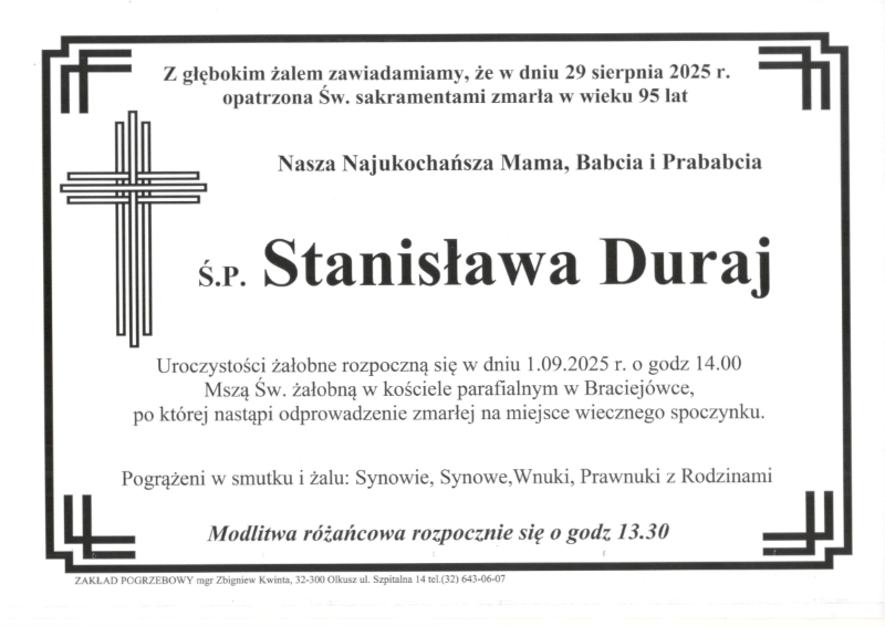 Pogrzeb śp. Stanisławy Duraj odbędzie się w dniu 1 września 2025 r. Nabożeństwo żałobne o godz. 14.00 w Kościele Parafialnym w Braciejówce. Sprawdź szczegóły uroczystości pogrzebowych klikając w klepsydrę… Modlimy się za duszę śp. Stanisławy, a rodzinie zmarłej składamy kondolencje.