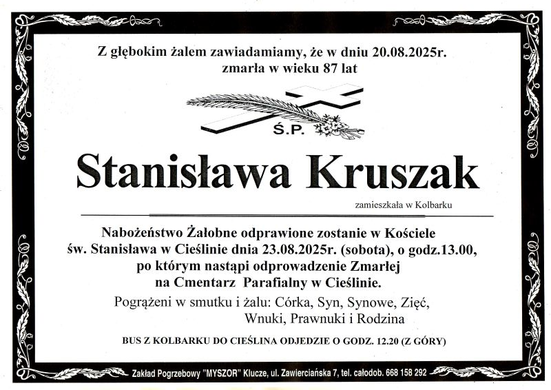 Pogrzeb śp. Stanisławy Kruszak odbędzie się w dniu 23 sierpnia 2025 r. Nabożeństwo żałobne o godz. 13.00 w Kościele Parafialnym w Cieślinie. Sprawdź szczegóły uroczystości pogrzebowych klikając w klepsydrę… Modlimy się za duszę śp. Stanisławy, a rodzinie zmarłej składamy kondolencje.