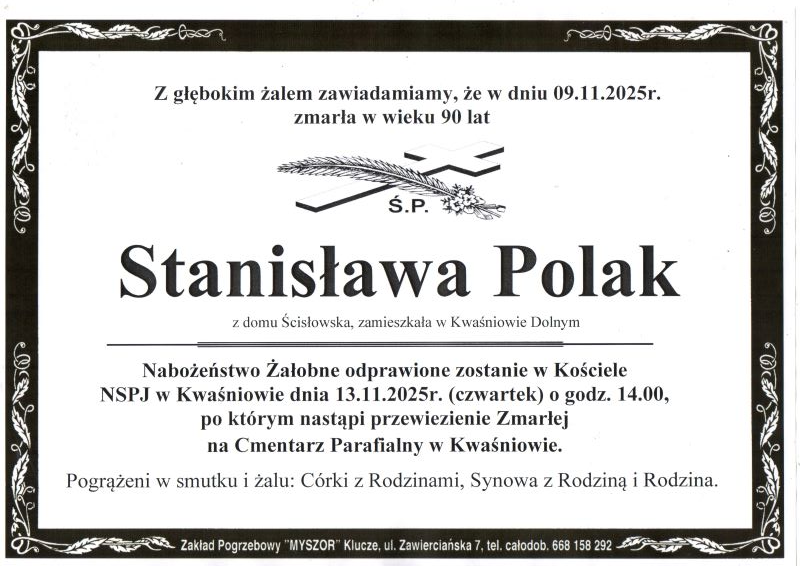 Pogrzeb śp. Stanisławy Polak odbędzie się w dniu 13 listopada 2025 r. Nabożeństwo żałobne o godz. 14.00 w Kościele Parafialnym w Kwaśniowie. Sprawdź szczegóły uroczystości pogrzebowych klikając w klepsydrę… Modlimy się za duszę śp. Stanisławy, a rodzinie zmarłej składamy kondolencje.