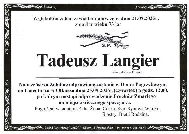 Zmarł śp. Tadeusz LANGIER (lat 73) – (Olkusz).