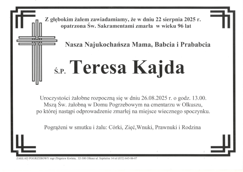 Pogrzeb śp. Teresy Kajdy odbędzie się w dniu 26 sierpnia 2025 r. Nabożeństwo żałobne o godz. 13.00 w Domu Pogrzebowym na cmentarzu w Olkuszu. Sprawdź szczegóły klikając w klepsydrę… Modlimy się za duszę śp. Teresy, a rodzinie zmarłej składamy kondolencje.