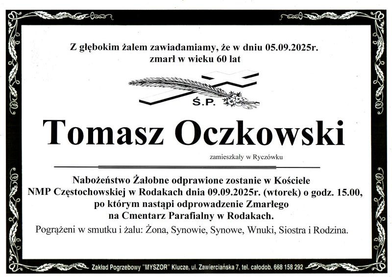 Pogrzeb śp. Tomasza Oczkowskiego odbędzie się w dniu 9 września 2025 r. Nabożeństwo żałobne o godz. 15.00 w Kościele Parafialnym w Rodakach. Sprawdź szczegóły uroczystości pogrzebowych klikając w klepsydrę… Modlimy się za duszę śp. Tomasza, a rodzinie zmarłego składamy kondolencje.