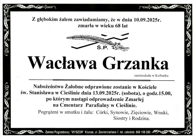 Pogrzeb śp. Wacławy Grzanki odbędzie się w dniu 13 września 2025 r. Nabożeństwo żałobne o godz. 15.00 w Kościele Parafialnym w Cieślinie. Sprawdź szczegóły uroczystości pogrzebowych klikając w klepsydrę… Modlimy się za duszę śp. Wacławy, a rodzinie zmarłej składamy kondolencje.