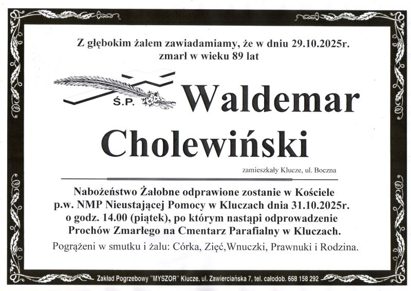 Pogrzeb śp. Waldemara Cholewińskiego odbędzie się w dniu 31 października 2025 r. Nabożeństwo żałobne o godz. 14.00 w Kościele Parafialnym w Kluczach. Sprawdź szczegóły uroczystości pogrzebowych klikając w klepsydrę… Modlimy się za duszę śp. Waldemara, a rodzinie zmarłego składamy kondolencje.