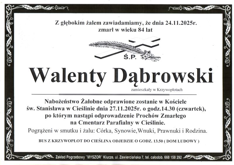 Pogrzeb śp. Walentego Dąbrowskiego odbędzie się w dniu 27 listopada 2025 r. Nabożeństwo żałobne o godz. 14.30 w Kościele Parafialnym w Cieślinie. Sprawdź szczegóły uroczystości pogrzebowych klikając w klepsydrę… Modlimy się za duszę śp. Walentego, a rodzinie zmarłego składamy kondolencje.
