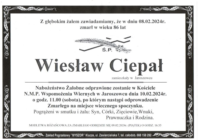 Zmarł śp. Wiesław CIEPAŁ (lat 86) – (Jaroszowiec).