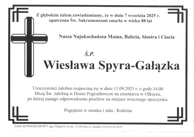Pogrzeb śp. Wiesławy Spyry-Gałązki odbędzie się w dniu 11 września 2025 r. Nabożeństwo żałobne o godz. 14.00 w Domu Pogrzebowym na cmentarzu w Olkuszu. Sprawdź szczegóły klikając w klepsydrę… Modlimy się za duszę śp. Wiesławy, a rodzinie zmarłej składamy kondolencje.