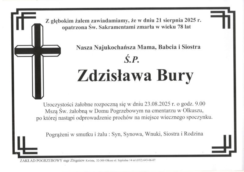 Pogrzeb śp. Zdzisławy Bury odbędzie się w dniu 23 sierpnia 2025 r. Nabożeństwo żałobne o godz. 9.00 w Domu Pogrzebowym na cmentarzu w Olkuszu. Sprawdź szczegóły klikając w klepsydrę… Modlimy się za duszę śp. Zdzisławy, a rodzinie zmarłej składamy kondolencje.