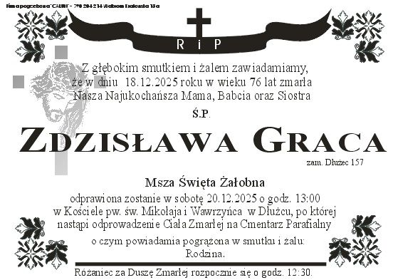 Pogrzeb śp. Zdzisławy Gracy odbędzie się w dniu 20 grudnia 2025 r. Nabożeństwo żałobne o godz. 13:00 w Kościele Parafialnym w Dłużcu. Sprawdź szczegóły uroczystości pogrzebowych klikając w klepsydrę… Modlimy się za dusze śp. Zdzisławy, a rodzinie zmarłej składamy kondolencje.