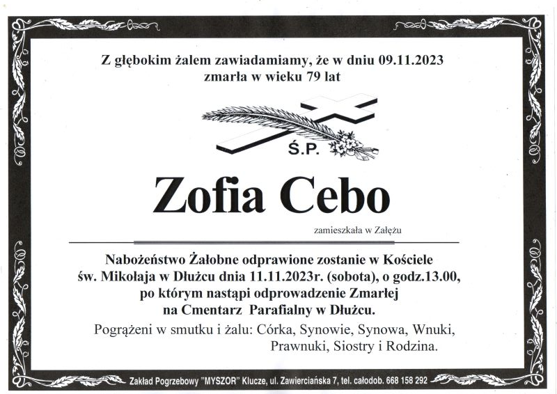 Pogrzeb śp. Zofii Cebo odbędzie się w dniu 11 listopada 2023 r. Nabożeństwo żałobne o godz. 13.00 w Kościele Parafialnym w Dłużcu. Sprawdź szczegóły uroczystości pogrzebowych klikając w klepsydrę… Modlimy się za duszę śp. Zofii, a rodzinie zmarłej składamy kondolencje.