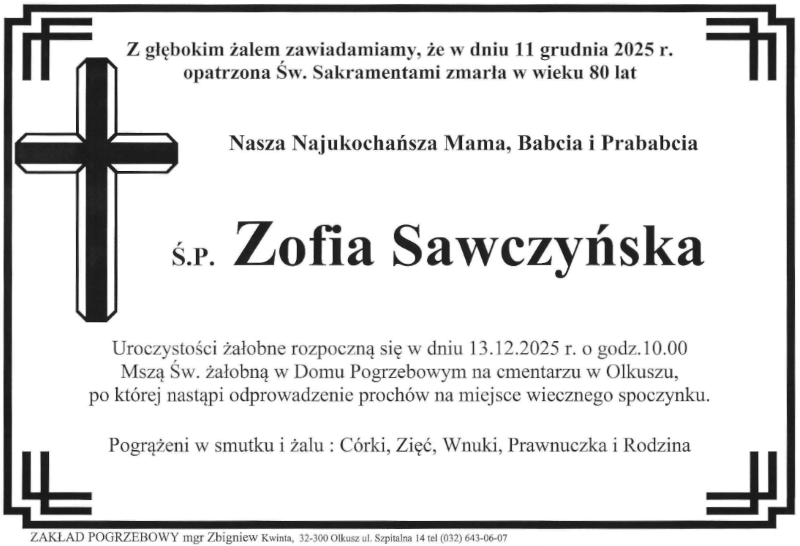 Pogrzeb śp. Zofii Sawczyńskiej odbędzie się w dniu 13 grudnia 2025 r. Nabożeństwo żałobne o godz. 10.00 w Domu Pogrzebowym na cmentarzu w Olkuszu. Sprawdź szczegóły klikając w klepsydrę… Modlimy się za duszę śp. Zofii, a rodzinie zmarłej składamy kondolencje.