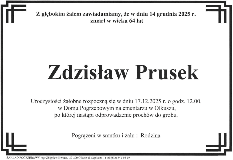 Zmarł Zdzisław PRUSEK (lat 64) – (Olkusz).