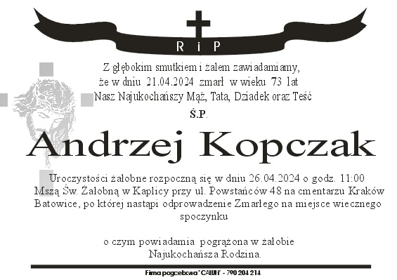 Pogrzeb śp. Andrzeja Kopczaka odbędzie się w dniu 26 kwietnia 2024 r. Nabożeństwo żałobne o godz. 11:00 w Kaplicy przy ul. Powstańców 48 na cmentarzu w Krakowie Batowicach. Sprawdź szczegóły uroczystości pogrzebowych klikając w klepsydrę… Modlimy się za dusze śp. Andrzeja, a rodzinie zmarłego składamy kondolencje.