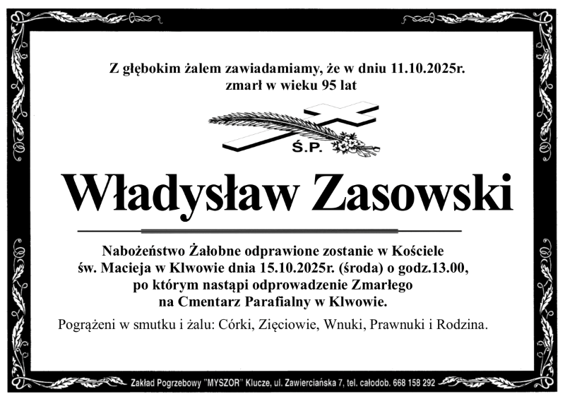 Pogrzeb śp. Władysława Zasowskiego odbędzie się w dniu 15 października 2025 r. Nabożeństwo żałobne o godz. 13.00 w Kościele Parafialnym w Klwowie. Sprawdź szczegóły uroczystości pogrzebowych klikając w klepsydrę… Modlimy się za duszę śp. Władysława, a rodzinie zmarłego składamy kondolencje.